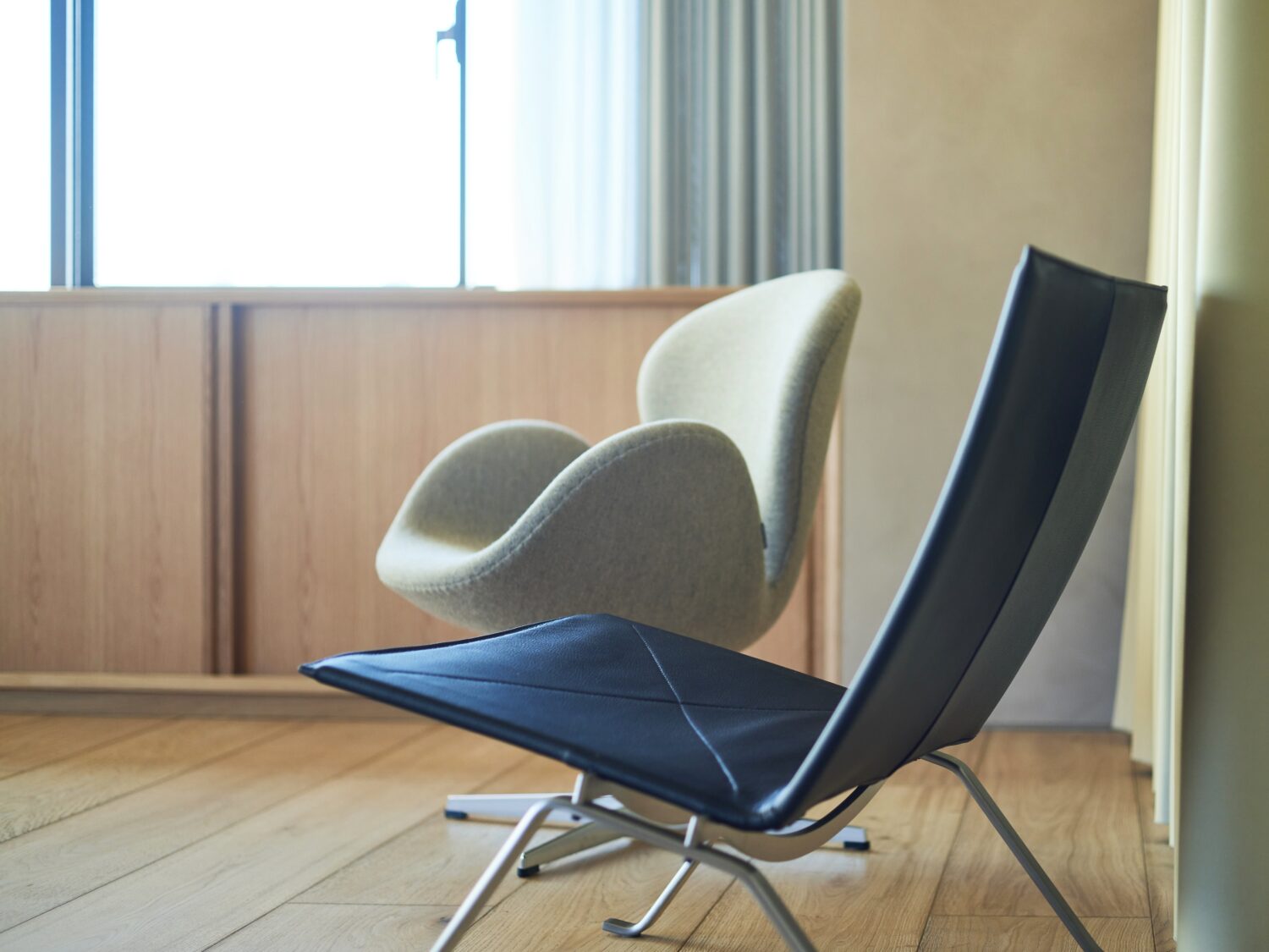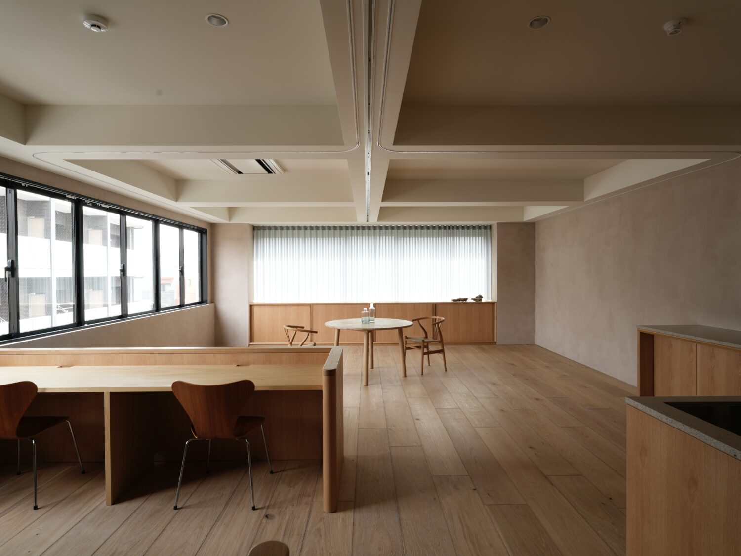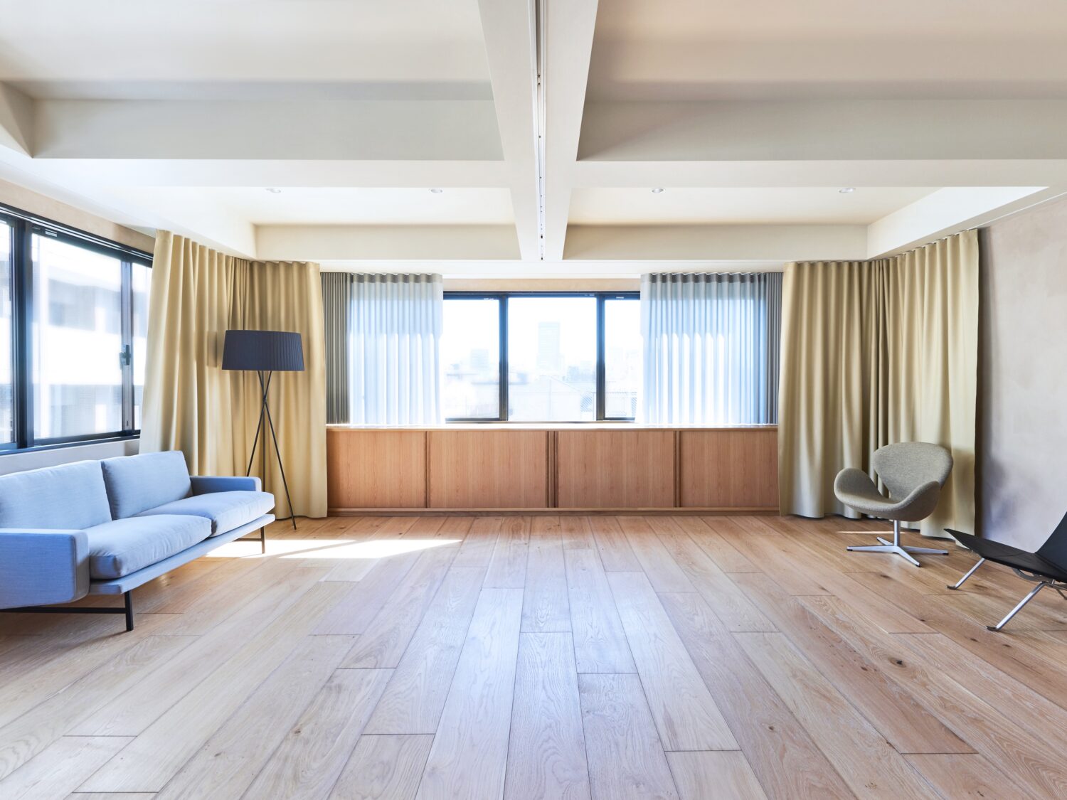 神楽坂の街を望む6階に位置する「ARIGATO Living」は、周囲に視界を遮る建物が少なく、大きな窓から安定した自然光が差し込む明るく開放感のある空間です。室内には北欧の名作家具と無垢材のフローリングを配し、品のある佇まいを形成。スタジオ全体を使った撮影に加え、展示会やワークショップなどのイベント利用にも対応。仕切り用カーテンを活用すれば、小規模な動画配信やオンライン会議など、用途に応じたゾーニングも可能です。さらに、カメラやマイクといった機材(※備品はすべて無料)も備えており、機材を最小限に抑えながら、撮影から配信までをスムーズに行える点も本スペースならではの特長となっています。