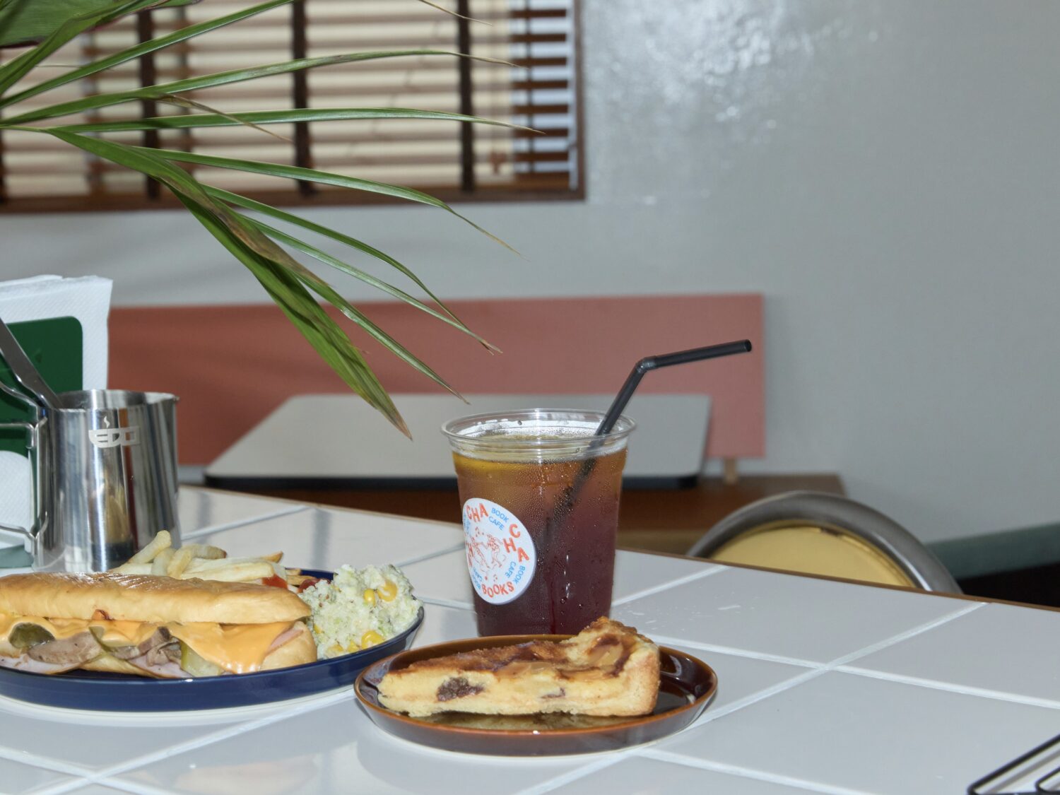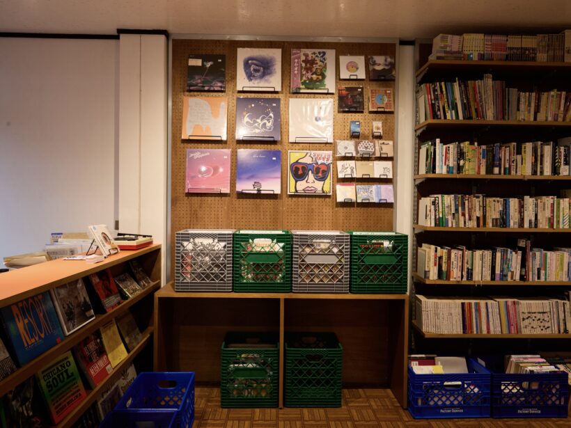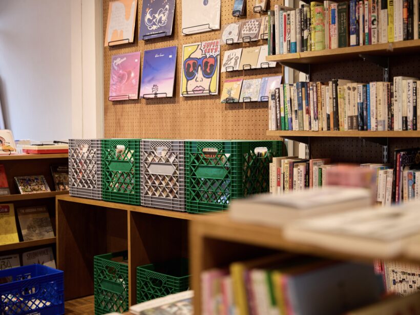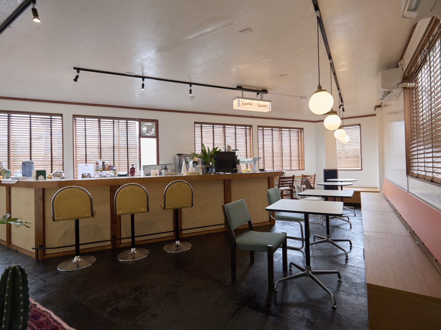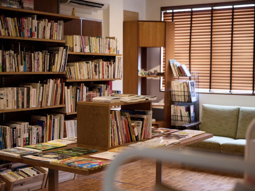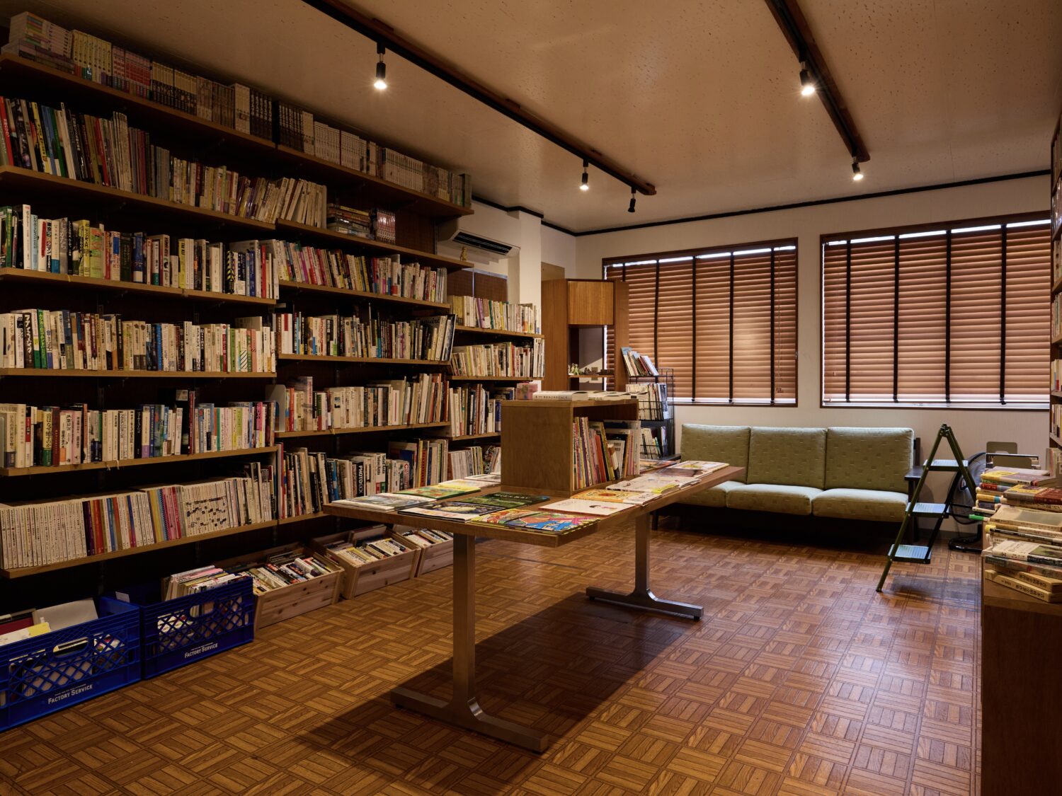 「Cha Cha Cha Books」は、本と音楽、そしてカフェバーがゆるやかに交差するブックカフェ。階段を上ると、右手には本とレコード、左手にはカフェバーのスペースが広がります。「サンプリングして店をつくり、DJのように本を並べる」というコンセプトのもと、中央テーブルの新刊本と壁面の古本棚が重なり、空間の背景として心地よい情報量が整えられています。視線が自然に流れる棚のリズムと、カフェバーのやわらかな空気が空間に奥行きを生み、本を手に取ったりグラスを傾けたりする何気ない動きが、そのまま絵になるロケーションです。