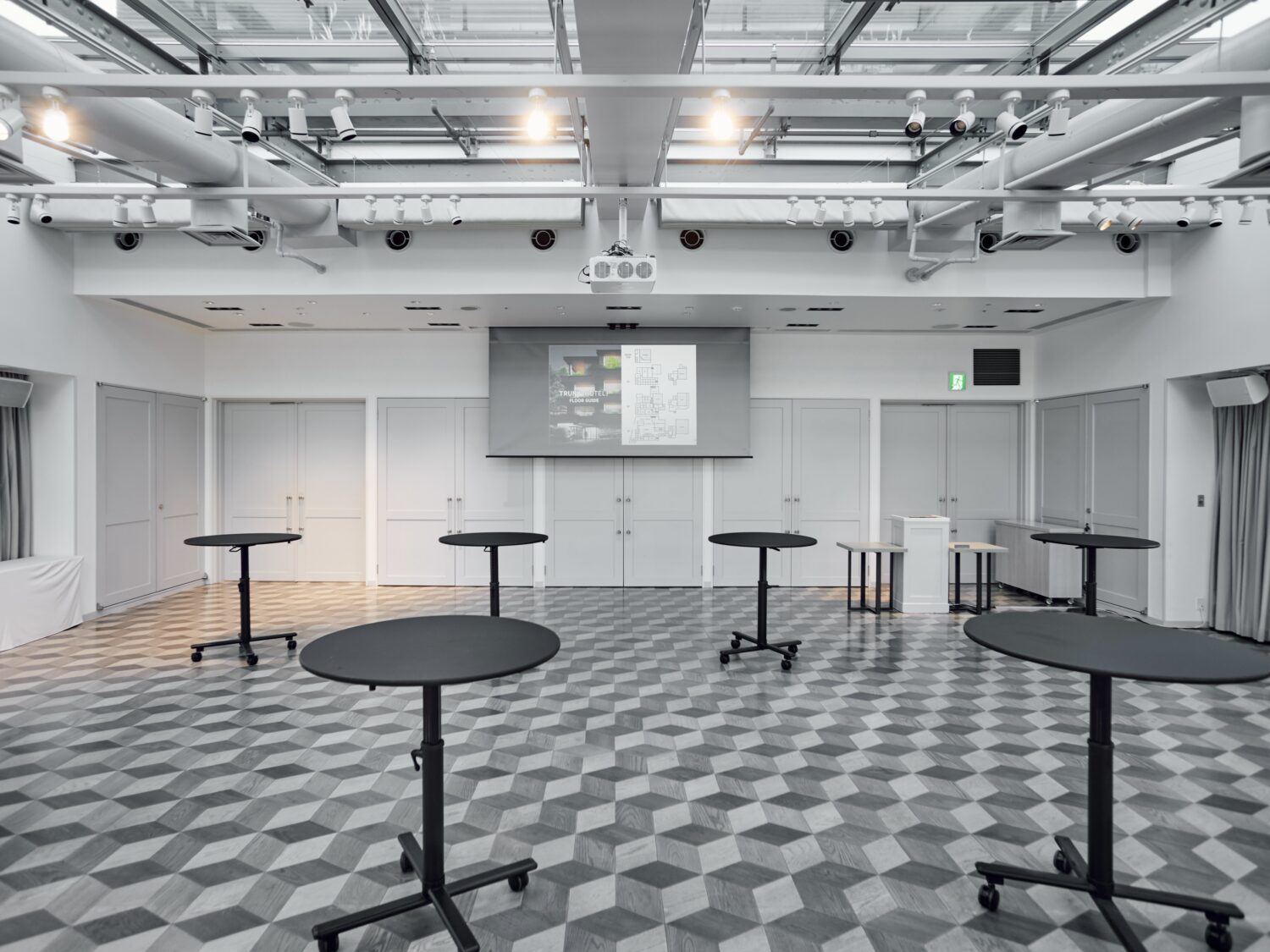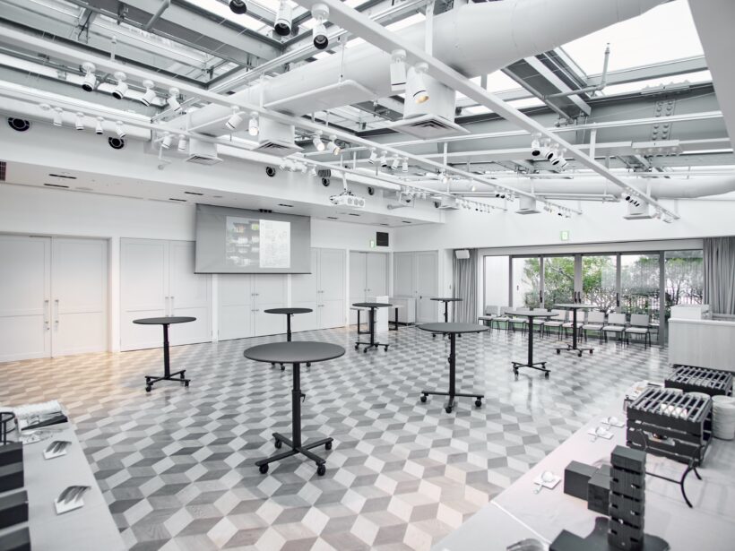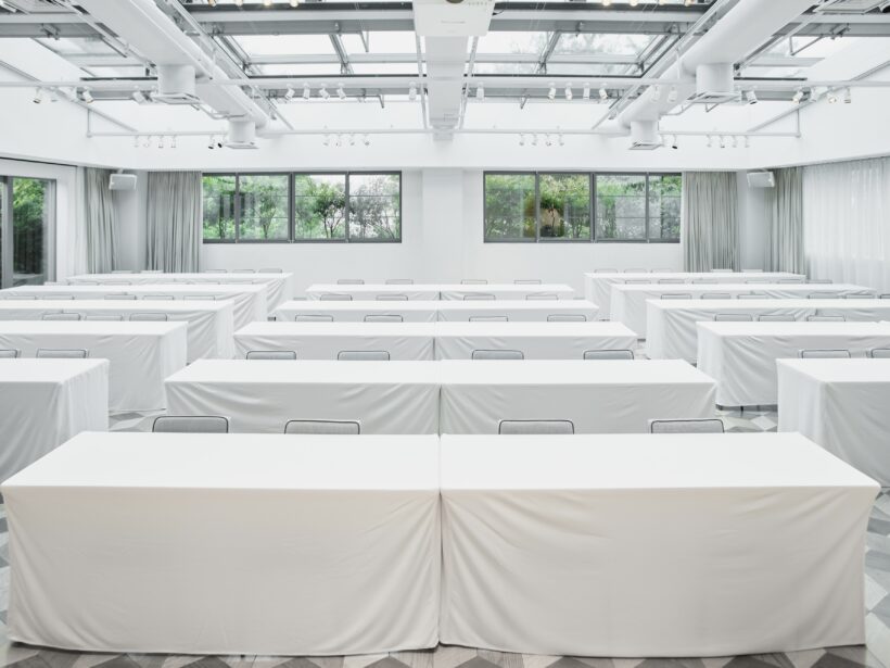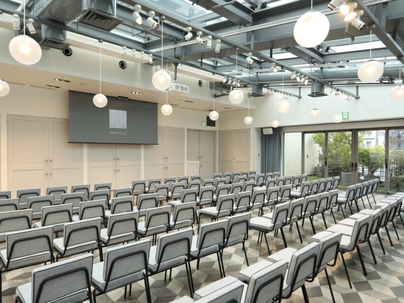 TRUNK(HOTEL) CAT STREETは、東京の“いま”を映し出すライフスタイルホテルです。その最上階に位置する「SORANIWA」は、4面採光により、光の取り入れ方まで設計された明るく開放的な会場です。館内で最もコンパクトな会場で、オフサイトミーティングや化粧品の商品発表会などにも多くご利用いただいております。グレージュを基調とした空間は、シンプルにお使いいただくことも可能で、夜の時間帯には照明を落とし、キャンドルの灯りでガーデンパーティーのようなムードを演出できる点も特徴のひとつです。