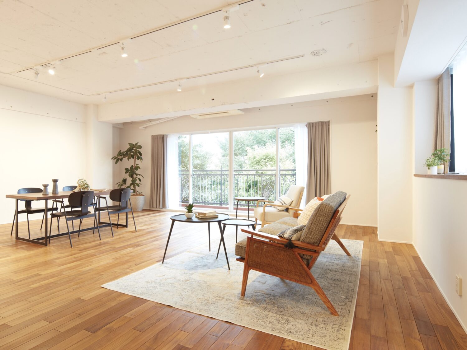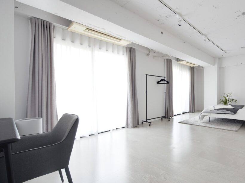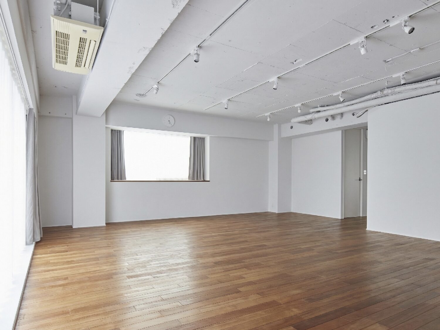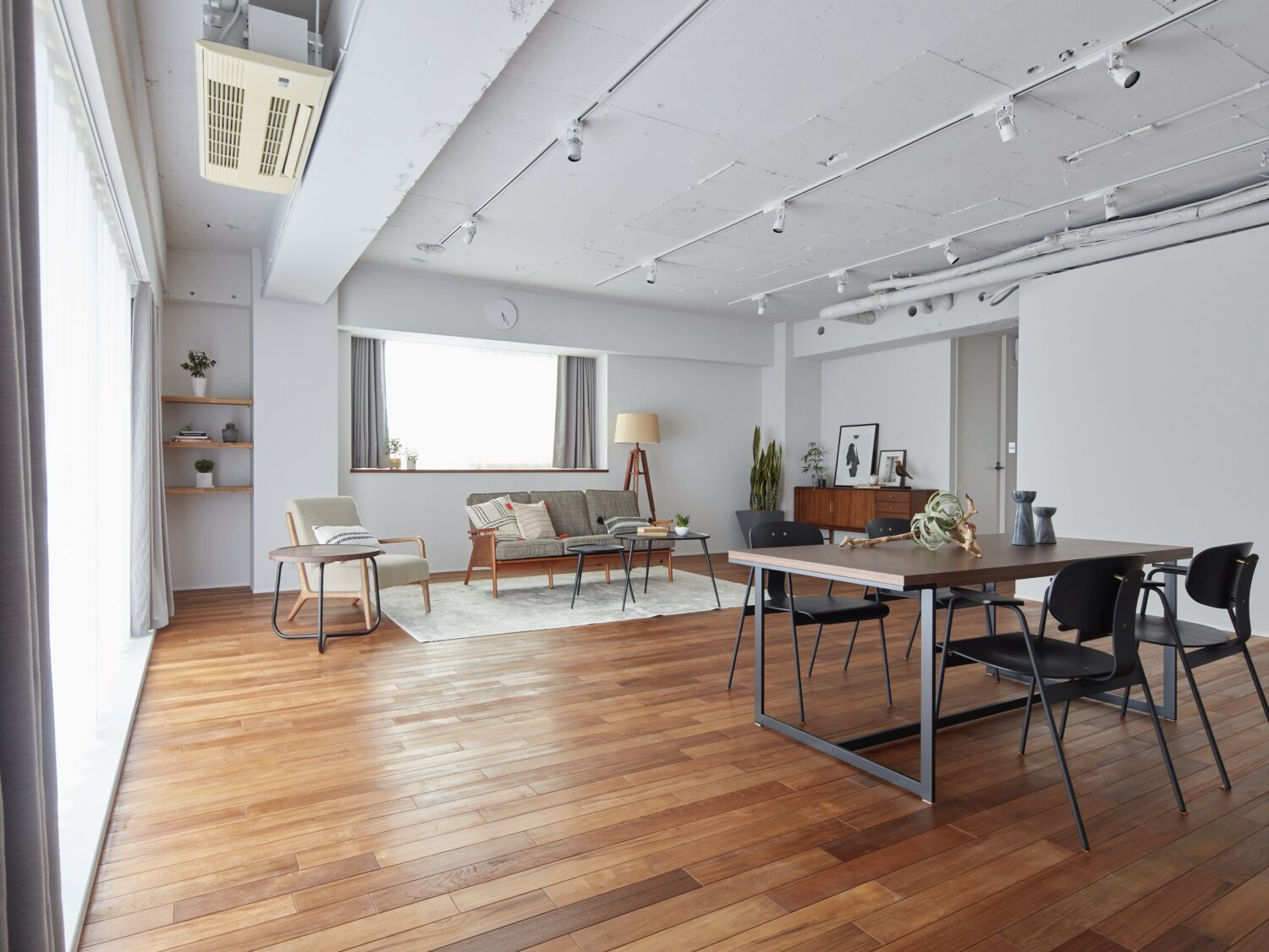大きな窓から自然光が差し込む、開放的なワンフロア空間。「STUDIO PEAK 表参道」の2Fは、家具を移動することでフラットに使えるレイアウトとなっており、展示会やイベントの会場としても使える高い自由度がポイント。自。白壁とフローリングをベースにしたシンプルな内装は、ブランドやプロダクトの世界観を引き立てるニュートラルな背景に。リビングとベッドルームで構成された空間は、必要に応じて生活シーンの演出も可能。自然光の入り方によって時間帯ごとに表情が変わり、展示と撮影の両方に対応可能です。さらに1F・3F・屋上まで活用することで、フロアごとに異なる演出を展開できるのも大きな魅力です。