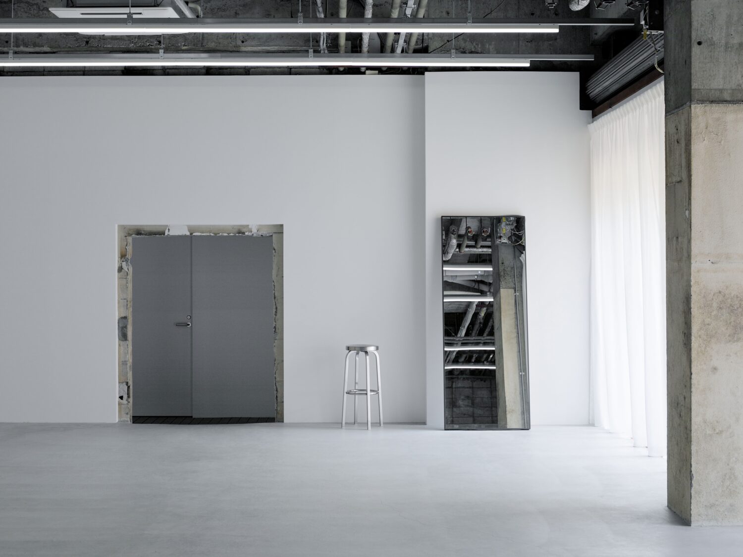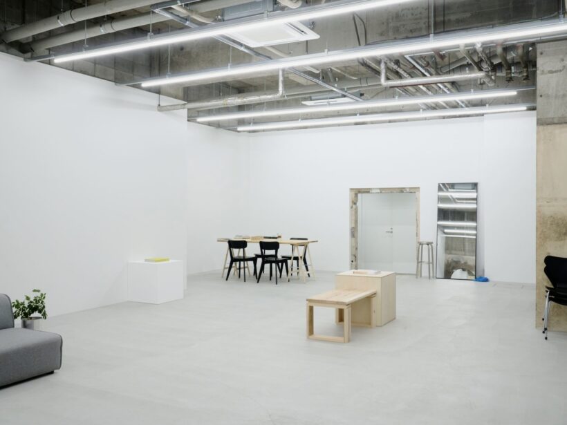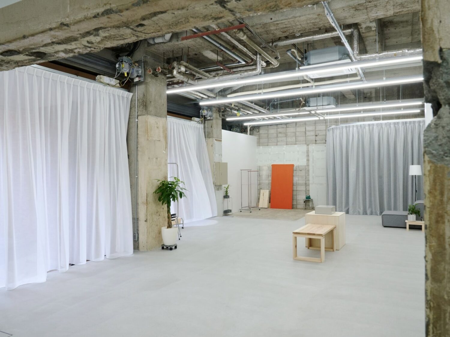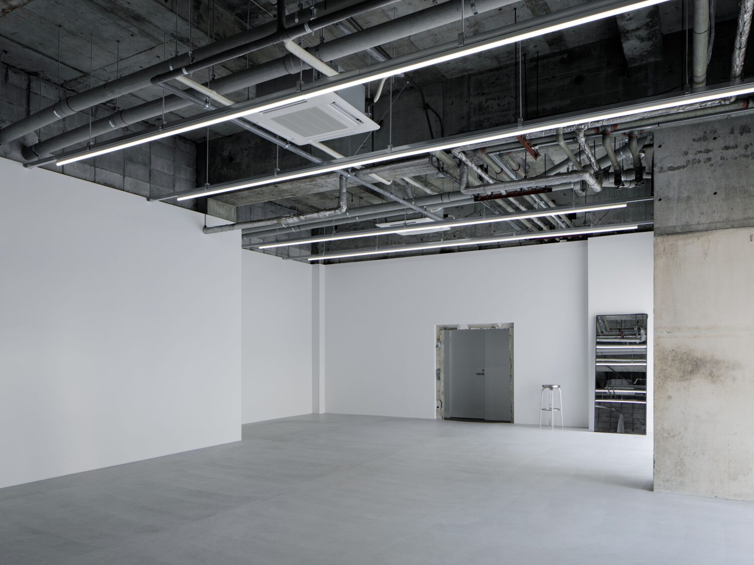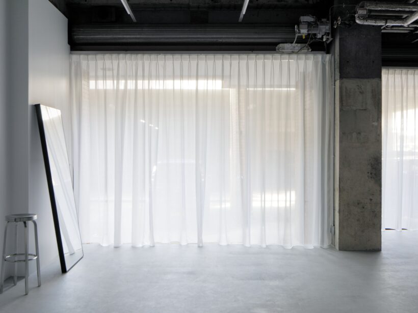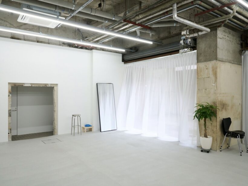 フォトグラファー上村銀次郎氏の制作拠点として設計されたスタジオ。ヴィンテージマンション地下に位置し、元工場の骨格を活かしながら、荒れたコンクリートや露出配管の質感を残しつつ、白を基調に再構築されています。無骨さと清潔感が拮抗する、独自の空気をまとった空間です。広さは93㎡平米、天井高は4m超。縦に抜けるスケールが、空間にゆとりをもたらします。さらに2面のシャッターを開放すれば、大きな開口から自然光が入り込み、シーンに応じた表情づくりが可能です。搬入動線も確保されており、ファッションやプロダクト撮影はもちろん、展示やポップアップにも対応。用途に応じて柔軟に使い分けられる空間となっています。