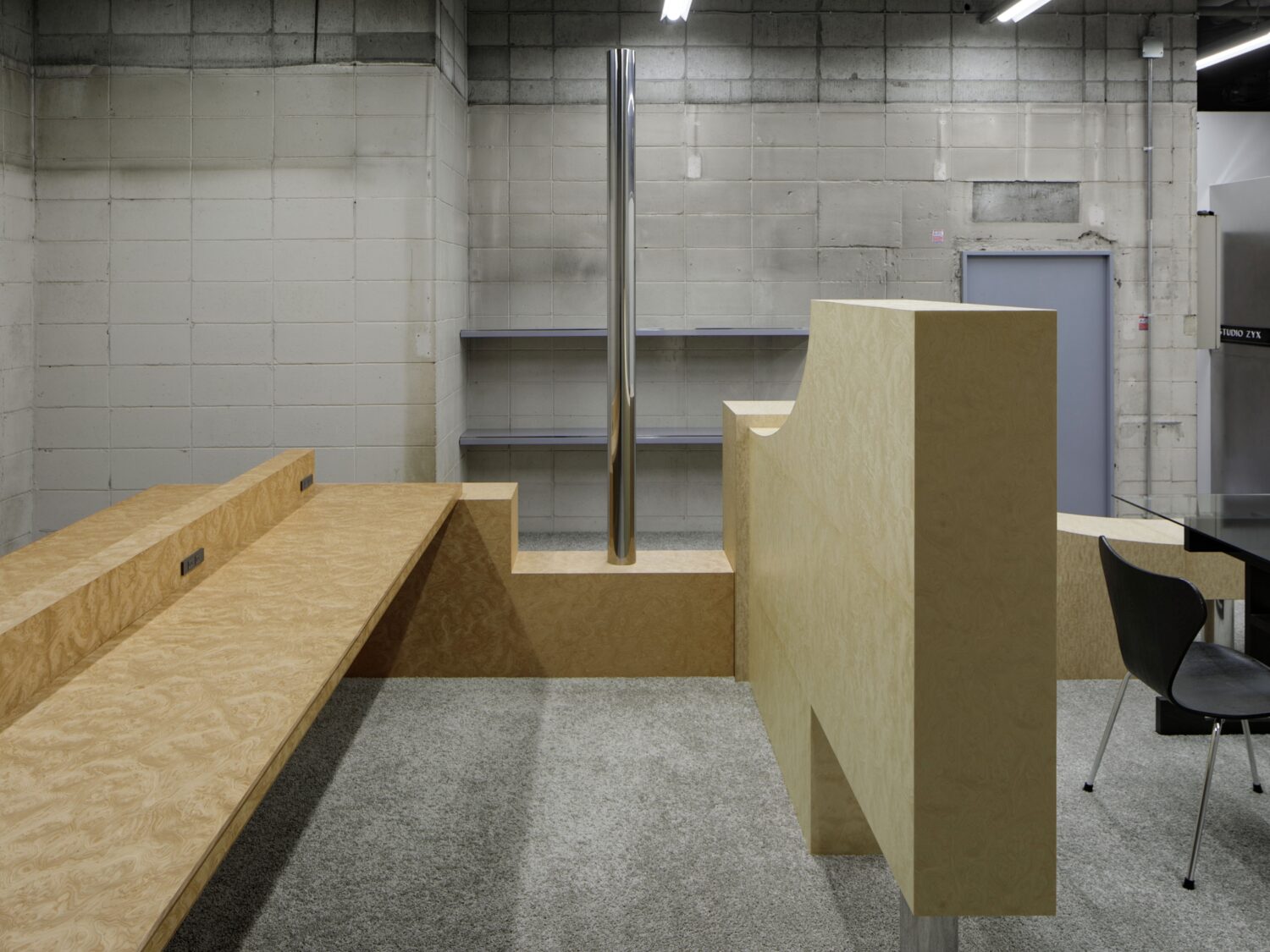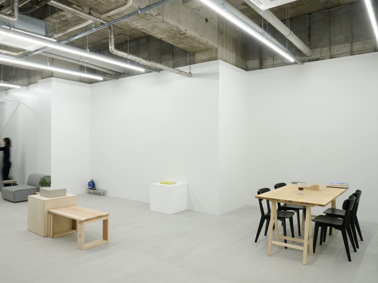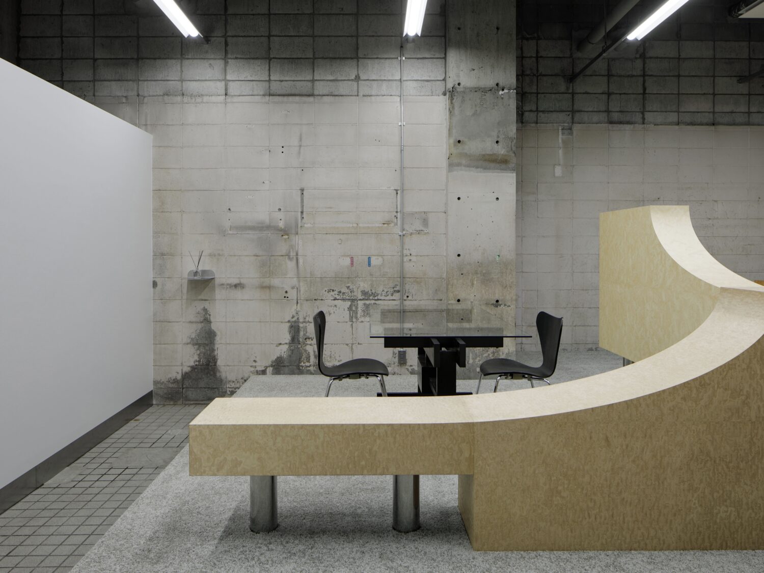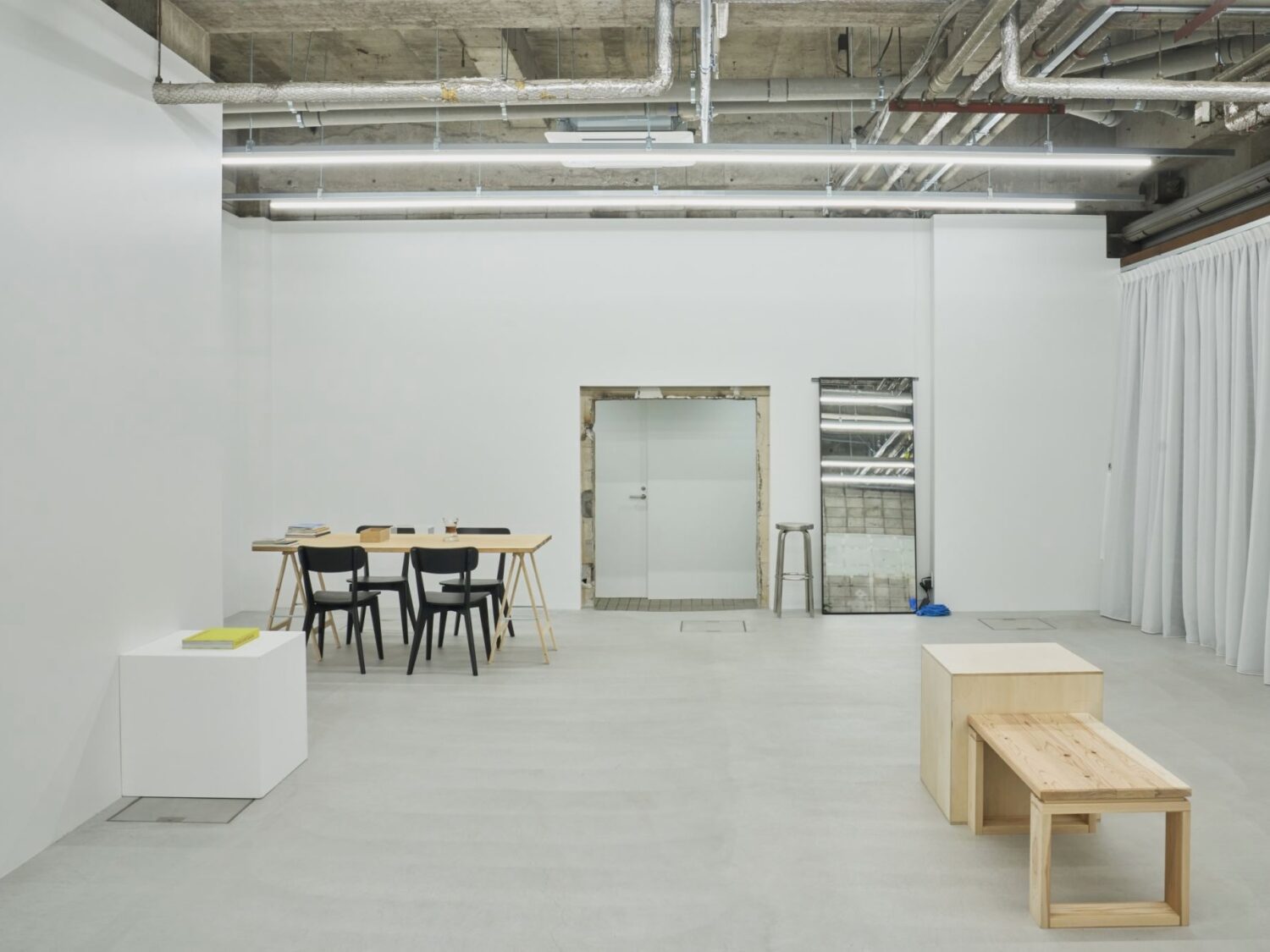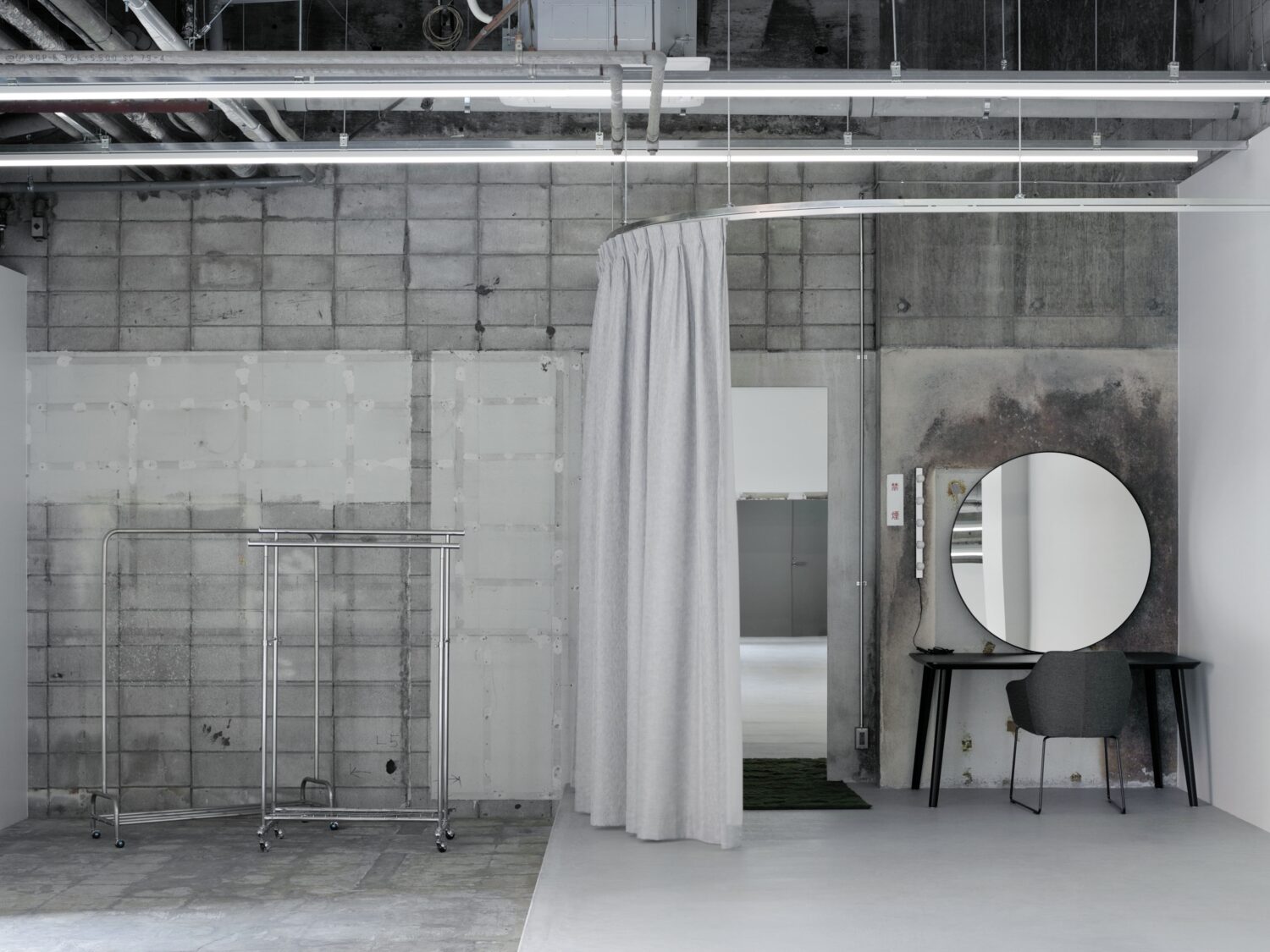 フォトグラファー上村銀次郎氏の制作拠点として設計されたスタジオ。ヴィンテージマンション地下に位置し、元工場の骨格を活かしながら、荒れたコンクリートや露出配管の質感を残しつつ、白を基調に再構築されています。無骨さと清潔感が拮抗する、独自の空気をまとった空間です。広さは93㎡平米、天井高は4m超。縦に抜けるスケールが、空間にゆとりをもたらします。さらに2面のシャッターを開放すれば、大きな開口から自然光が入り込み、シーンに応じた表情づくりが可能です。搬入動線も確保されており、ファッションやプロダクト撮影はもちろん、展示やポップアップにも対応。用途に応じて柔軟に使い分けられる空間となっています。