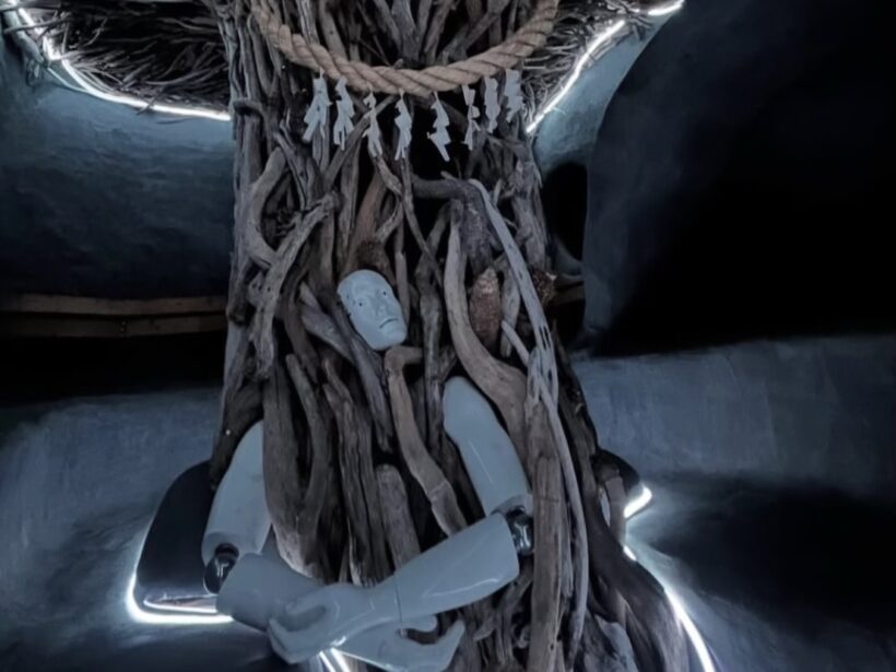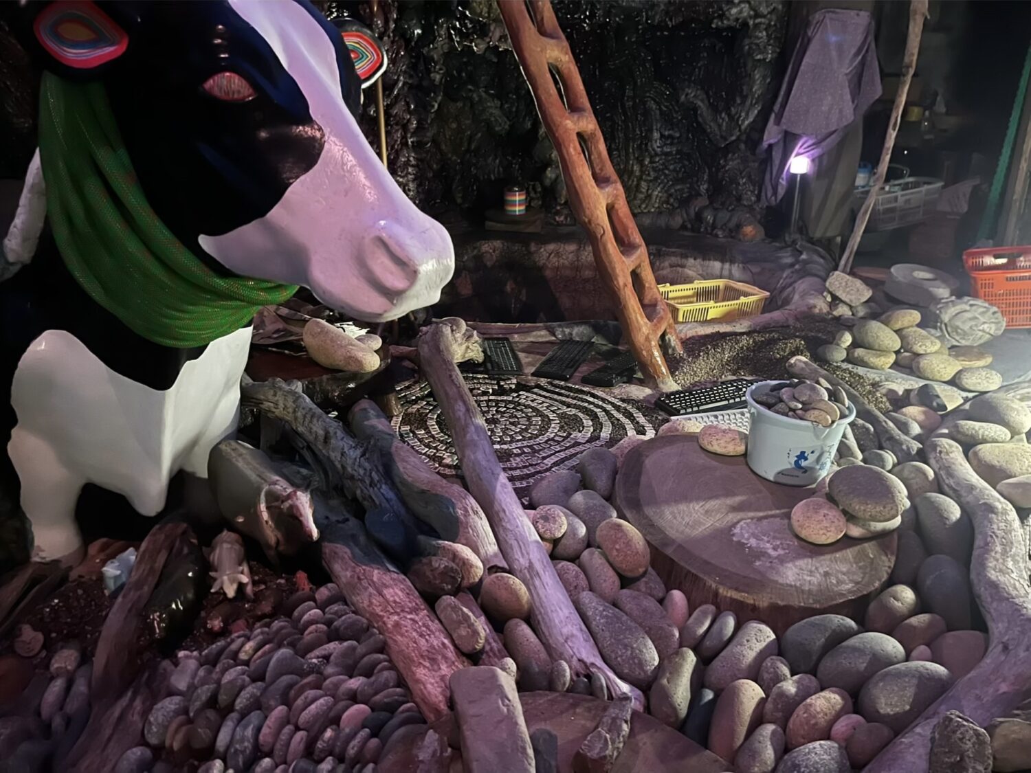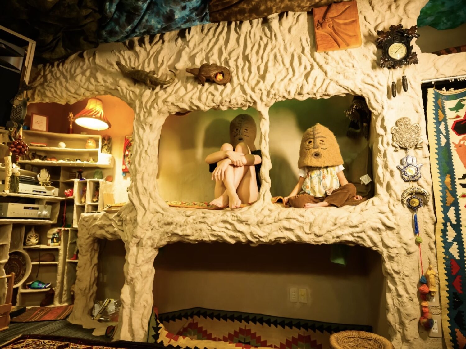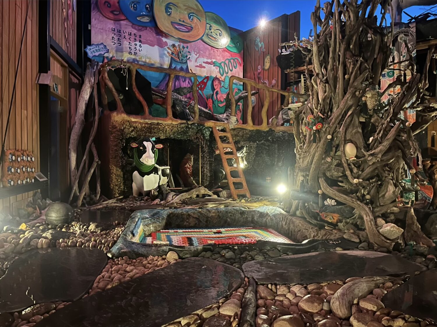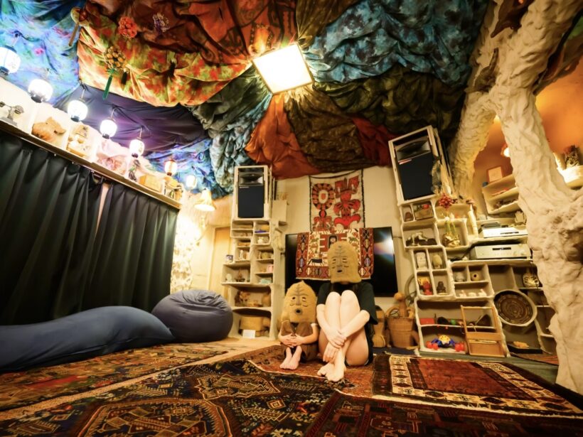 「サウナ発達」は、土でつくった洞窟サウナが主役です。夜は水面に灯りが映え、流木の塔や木の梯子、コラージュのように飾った回廊、仮面やオブジェが写真、映像に深みを出します。モノクロ漫画で覆われたトイレなど、遊び心のあるスポットも多数。映像、写真の撮影はもちろん、ウェルネスやライフスタイル、アート寄りの企画とも相性が良い空間です。くつろげる設備が整っており、少人数の合宿、アイデア出しの打ち合わせ、ミニイベントまで幅広く対応します。昔の湯治場を思わせる力強い体験と現代的な快適さを両立した、“ととのい”場をお楽しみください。